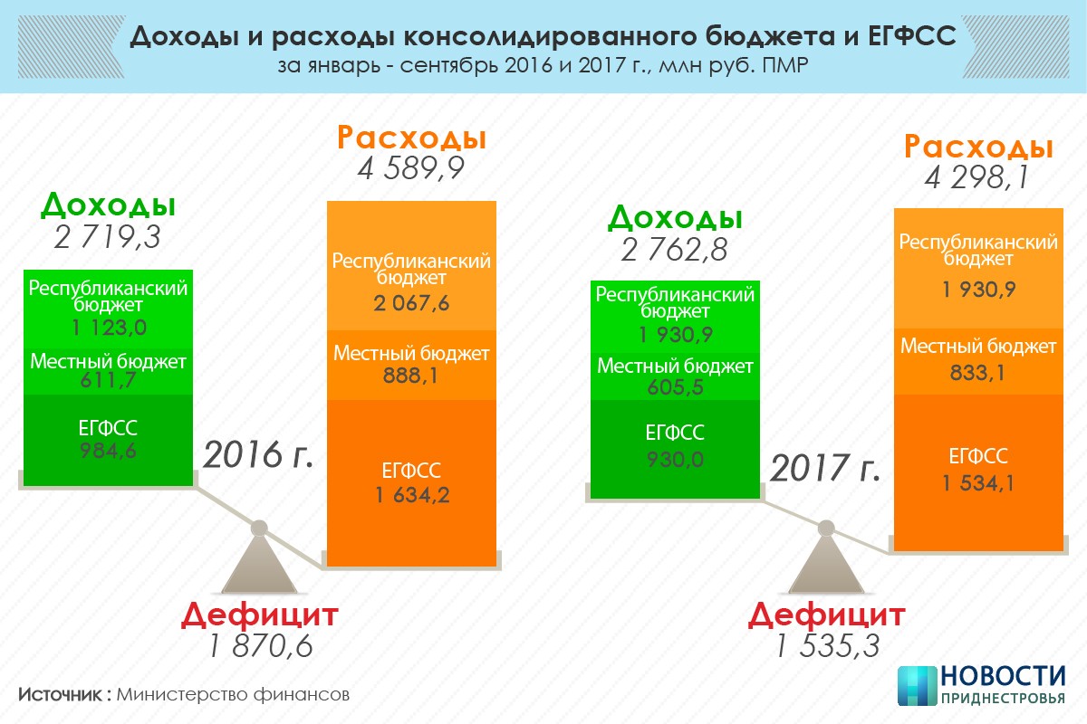 С начала года в доход республиканского бюджета поступил 1 млрд 227,3 млн рублей ПМР. По сравнению с аналогичным периодом 2016-го, доходы выросли на 9,3%, или на 104,3 млн руб. Расходы за этот период составили 1 930,9 млн руб., что на 136,7 млн руб. (или 6,6%) меньше, чем за январь-сентябрь 2016 года.