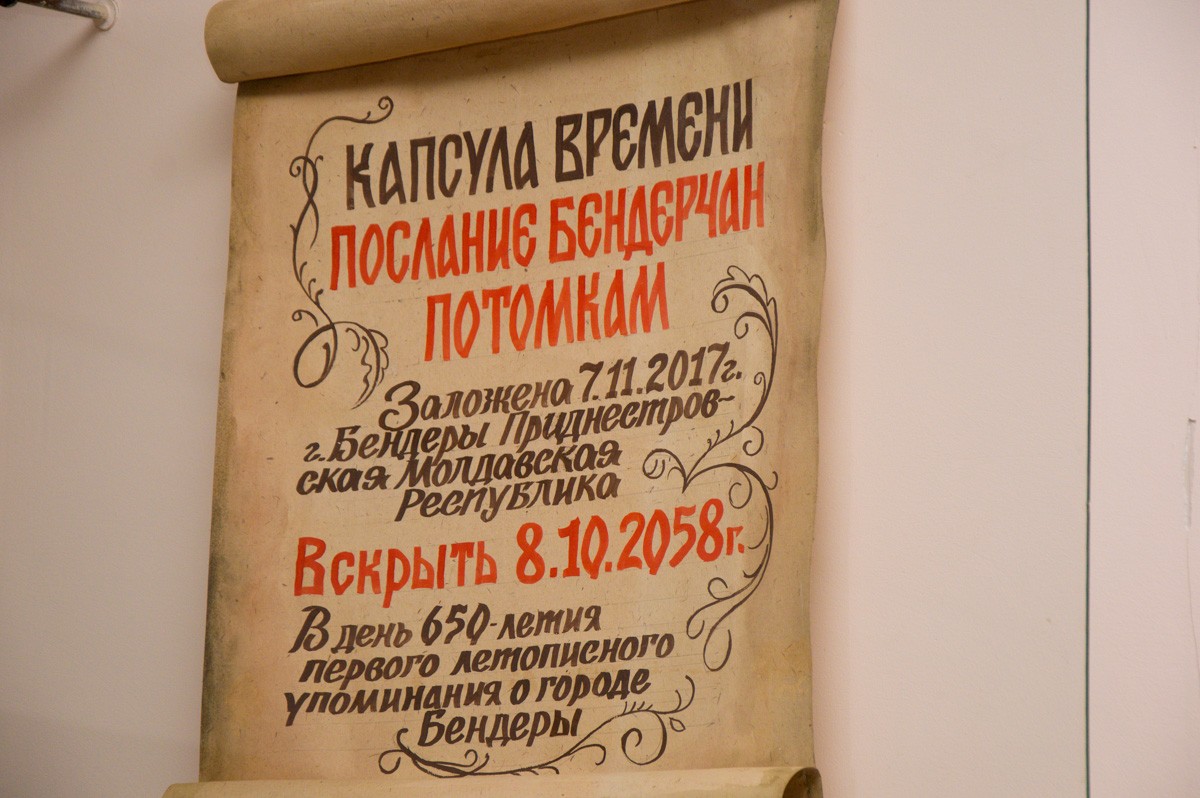 В капсулу, которую вскроют в 2058 году, в день 650-летия Бендер, заложили сразу несколько писем в будущее: послания от молодёжи и всех бендерчан, обращение почётного гражданина города Леонида Литвиненко, материалы, подготовленные общественными организациями. В капсулу времени поместили и приднестровские деньги, праздничный выпуск газеты «Новое время», флешку с песнями о городе и фильмами Бендерского телевидения. Оттиск ладошки 4- летней бендерчанки Любы также будет находиться в капсуле. Это уже история.