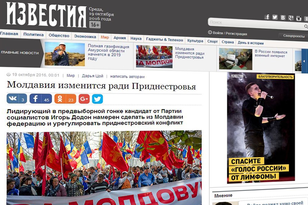 Российское издание «Известия» опубликовало статью о том, как в Приднестровье отреагировали на слова лидера молдавских социалистов Игоря Додона о будущем республики в составе Молдовы. Лидирующий кандидат в президенты РМ заявил, что в случае своего избрания предложит Тирасполю статус субъекта федерации.