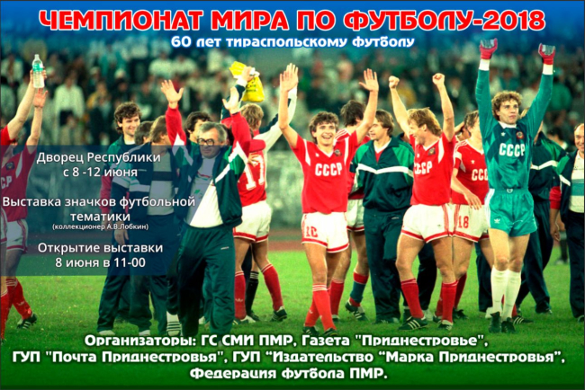 04 Июн., 2018, 17:24Тирасполь, 4 июня. /Новости Приднестровья/. С 8 по 12 июня под патронажем Госслужбы СМИ, газеты «Приднестровье», ГУП «Почта Приднестровья», ГУП «Издательство «Марка Приднестровья» и Федерации футбола ПМР состоятся выставка коллекции значков футбольной тематики, гашение почтовых марок, приуроченные к предстоящему Чемпионату мира по футболу в Москве.