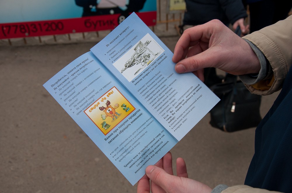 «В 16 точках города активисты раздают буклеты с краткой информацией о том, как поступать людям в той или иной ситуации, когда были нарушены их права как потребителей. Мы постарались отразить все ситуации, в которые может попасть обычный потребитель, кратко и доступным языком, старались избегать каких-то юридических формулировок, которые непонятны обычному человеку», – рассказала начальник государственной инспекции надзора в сфере технического регулирования и защиты прав потребителей Службы госнадзора Министерства юстиции Марина Иващук.