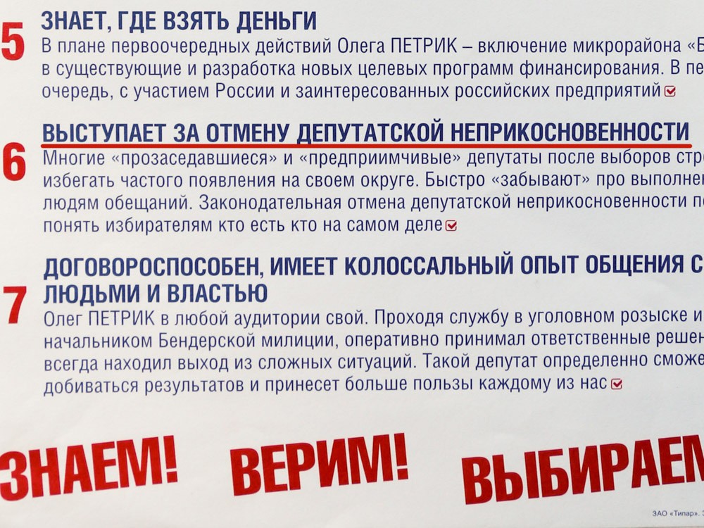 В первом чтении приднестровские парламентарии приняли поправки в конституцию, в которых сказано, что «депутат Верховного Совета обладает неприкосновенностью в течение всего срока его полномочий, а также по истечении срока депутатских полномочий за деяния, совершенные им в период исполнения полномочий депутата Верховного Совета».
