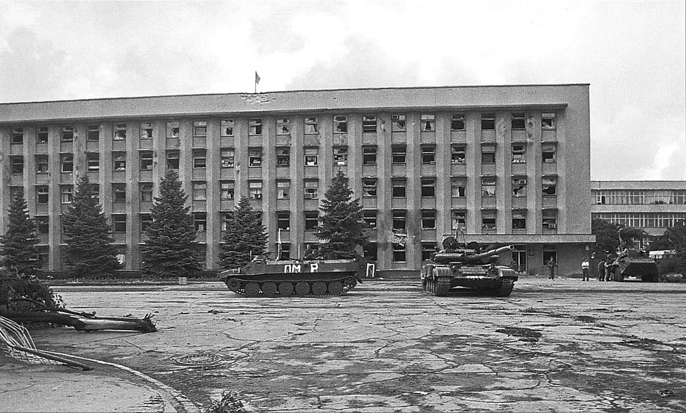 Где-то на окраинах города, со стороны Каушан, послышалась стрельба. Спустя некоторое время со стороны улицы Суворова на площадь (площадь Освобождения) выезжает БТР, идет мимо горисполкома, разворачивает башню с пулеметами и открывает огонь. Обстреляв второй этаж, он завернул за угол улицы Советской. Затем выехал другой БТР, и все по той же схеме. Так они повторяли эту «карусель». Если бы мы открыли ответный огонь, то раскрыли бы себя, и тогда от нас бы мокрого места не осталось. Решили отступить в здание. Попытались зайти в горисполком через центральный вход, но тут по нам начали автоматчики стрелять. Нашли пожарный выход и уже через него вбежали внутрь здания.