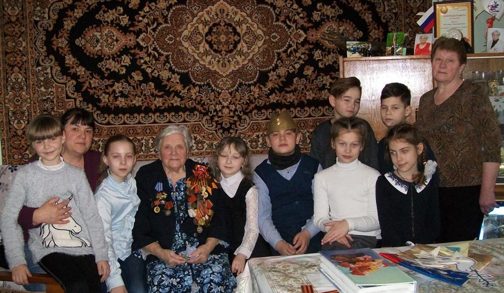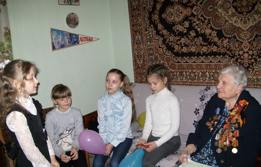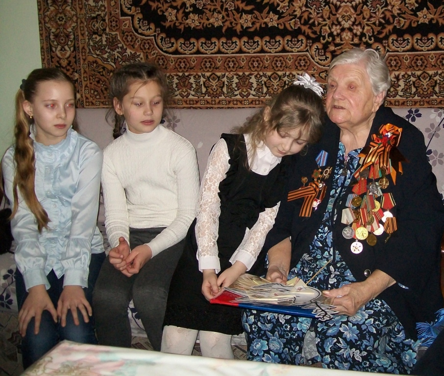 В ходе встречи дети узнали о тяжёлых военных годах, о жизни и боевом пути Евгении Григорьевны. Дети разглядывали награды ветерана, а также выступали с подготовленными номерами: ребята читали стихи и пели песни. Затем вручили ветерану письмо-треугольник, повязали георгиевскую ленточку и подарили мэрцишоры, которые сделали своими руками.