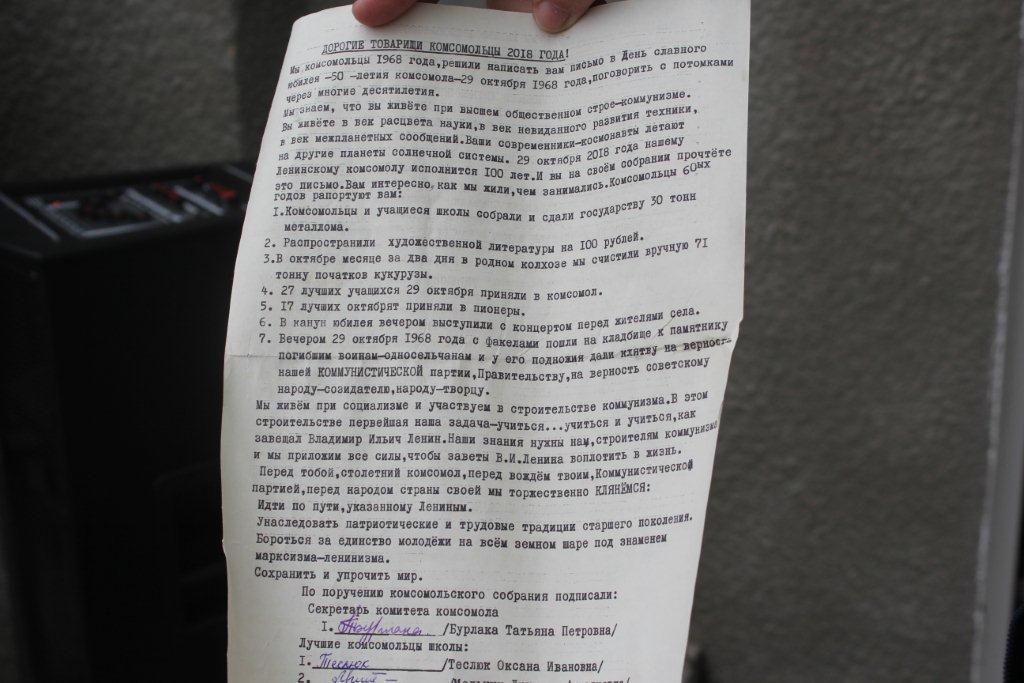 Комсомольцы отчитались перед своими сверстниками из будущего столетия о проделанной работе по сбору металлолома, распространению художественной литературы, помощи родному колхозу. В послании они также дали клятву столетнему комсомолу и Коммунистической партии идти по пути, указанному Лениным, бороться за единство молодёжи всего мира под знаменем марксизма-ленинизма, сохранять мир.