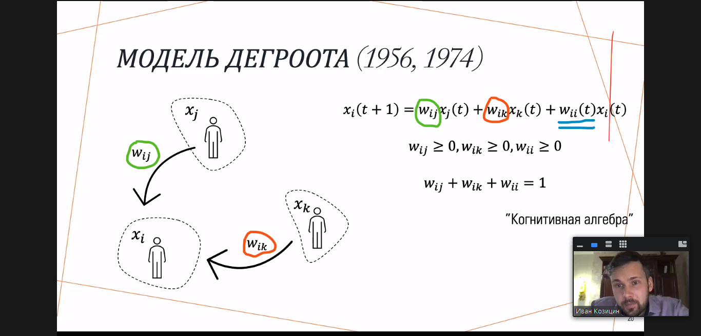 Измерять текущее (и предсказывать будущее) поведение и изменение мнения людей исследователи начали задолго до появления интернета еще в середине XX века. Например, есть модель Дегроота, по которой степень влияния на человека складывается из мнения его знакомых, весомости их взглядов для него, его собственной позиции, периода времени и иных переменных.