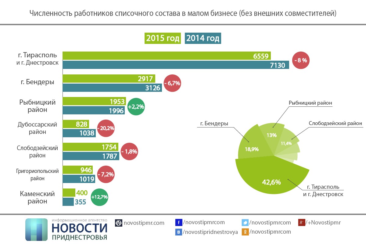Количество малых предприятий за прошедший год в Приднестровье практически не поменялось. Так, если на 1 января 2015 года в республике действовало 4 337 организации малого бизнеса, то спустя год их было 4333. Однако при этом на 6% уменьшилось число людей, занятых в сфере малого бизнеса.