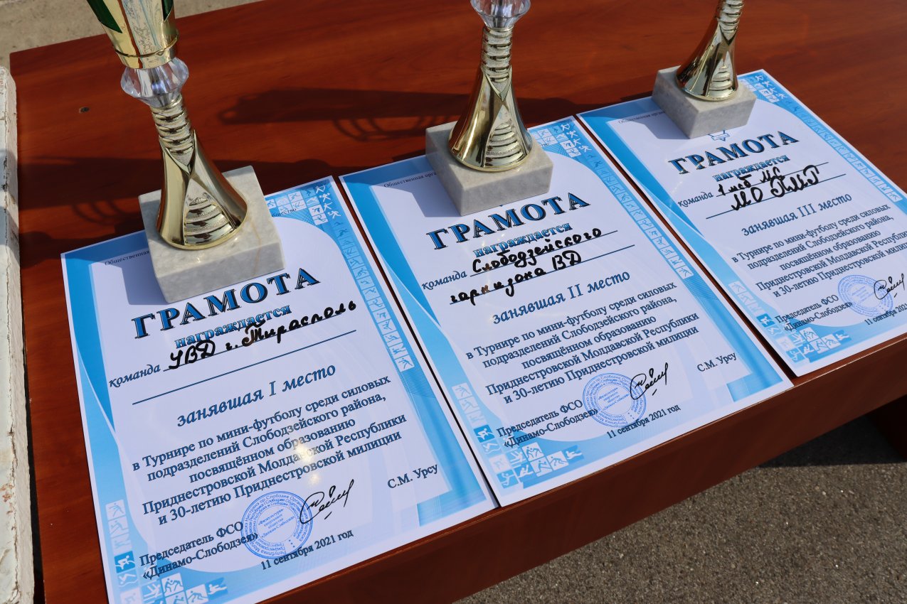 Слободзея, 11 сентября. /Новости Приднестровья/. На городском стадионе Слободзеи прошел турнир по мини-футболу среди сотрудников силовых структур. Соревнования провели в рамках празднования Дня Республики и приурочили к наступающему 30-летию образования приднестровской милиции. Их организаторами выступили Слободзейское РОВД и Управление по физической культуре, спорту, туризму и молодёжной политике.