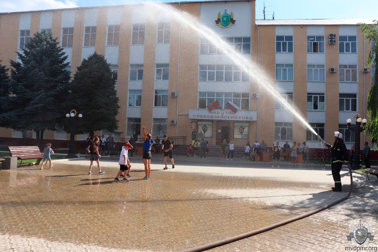 В завершение программы был подарок от пожарных: фонтан из настоящего брандспойта и радуга. Дети и взрослые с удовольствием искупались под тёплыми струями.