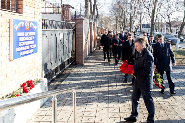 Сегодня президент возложил цветы к зданию выездного консульства РФ в Тирасполе и оставил слова соболезнования в Книге памяти и скорби