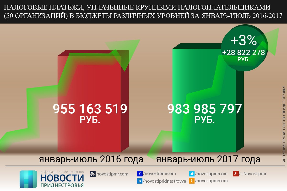 В целом за январь-июль 2017 года в бюджеты различных уровней от 50 крупных предприятий-налогоплательщиков поступило на 28,8 млн руб. или на 3,0% больше, чем в 2016 году.