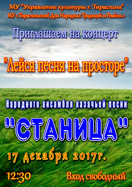 Тирасполь, 15 декабря. /Новости Приднестровья/. В это воскресенье, 17 декабря, в столичном Доме народных традиций и ремёсел состоится отчётный концерт народного ансамбля казачьей песни «Станица» под названием «Лейся песня на просторе».