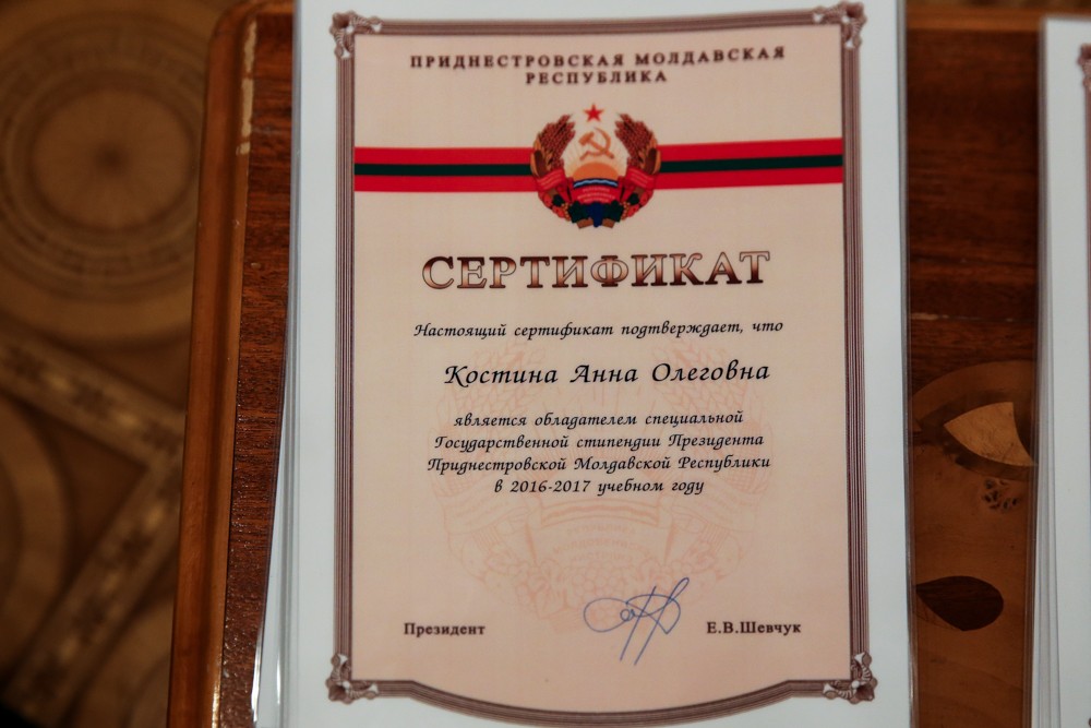 Тирасполь, 25 ноября. /ИА «Новости Приднестровья»/. В столичном Дворце Республики прошла церемония вручения специальной Президентской стипендии. С 2001-года её вручают лучшим студентам вузов, колледжей, техникумов, художественных, музыкальных и спортивных школ, а также школ искусств. Всего за 15 лет её получили более 1000 одарённых детей, отобранных по уже сложившимся критериям.