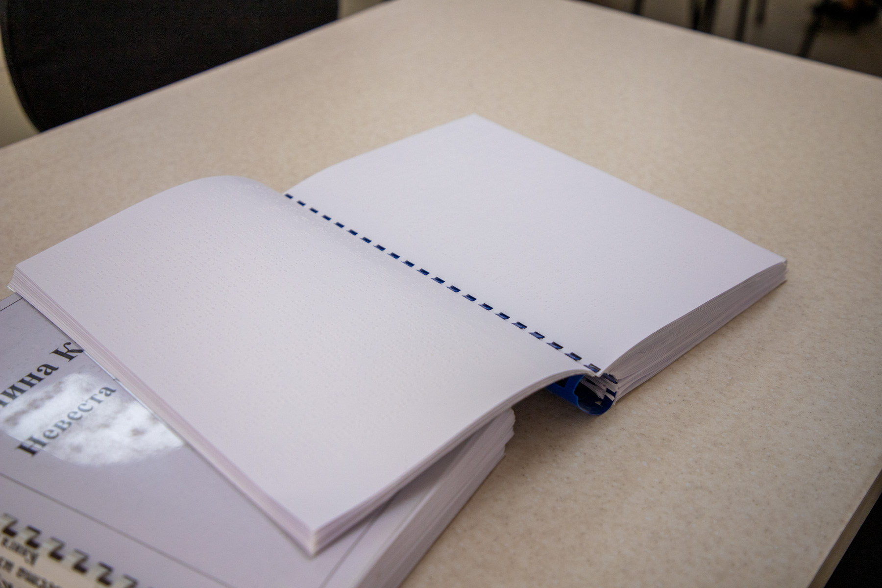 В читальном зале находится несколько стеллажей с книгами со шрифтом Брайля (специальное выпуклое тиснение, которое позволяет незрячим или слабовидящим людям на ощупь распознавать текст). Георгий Чебан отметил интересный факт: некоторые слепые читают даже быстрее, чем зрячие люди.