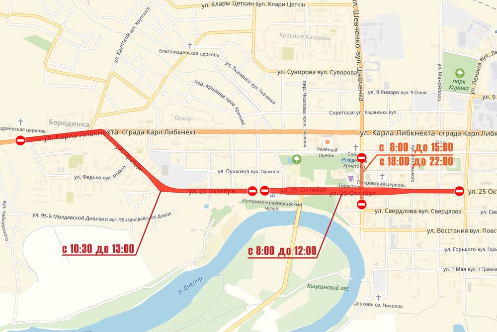 После церемонии возложения цветов на Мемориале Славы по ул. 25 Октября (от пер. Днестровский), по ул. Правды и ул. К. Либкнехта движение перекроют до входа на территорию ОГРВ для прохождения колонн «Бессмертного полка», ориентировочно с 10:30 до 13:00.