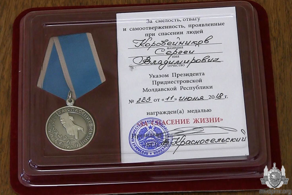Тирасполь, 13 июня. /Новости Приднестровья/. Министр внутренних дел Руслан Мова вручил медаль «За спасение жизни» 42-летнему жителю Днестровска Сергею Коробейникову. Рискуя собственной жизнью, мужчина вынес из задымлённой квартиры своих соседей 3-летнего мальчика и его прабабушку. К тому времени женщина, надышавшись продуктами горения, уже находилась без сознания, сообщает пресс-служба МВД ПМР.