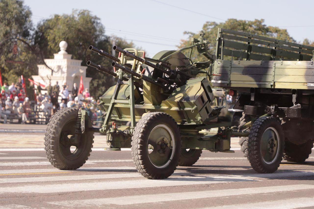 Среди боевой техники подразделений артиллерии были показаны 120-миллиметровые минометы, противовоздушной обороны – зенитно-пулемётные установки.