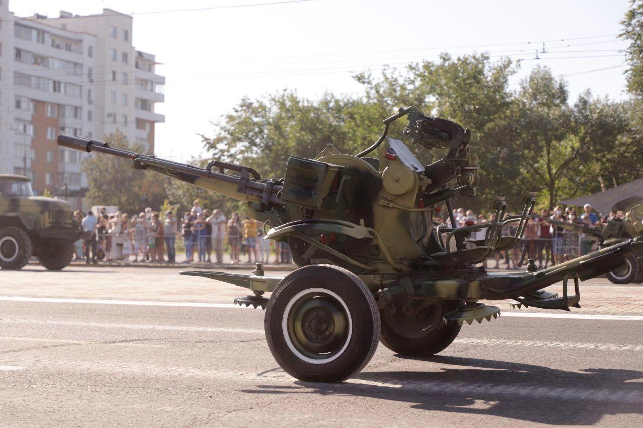 Кроме того, перед трибунами провезли дивизионные пушки Д-44 и батарею 100-миллиметровых противотанковых пушек. Зрители увидели и знаменитый зенитно-артиллерийский 100-миллиметровый комплекс КС-19.
