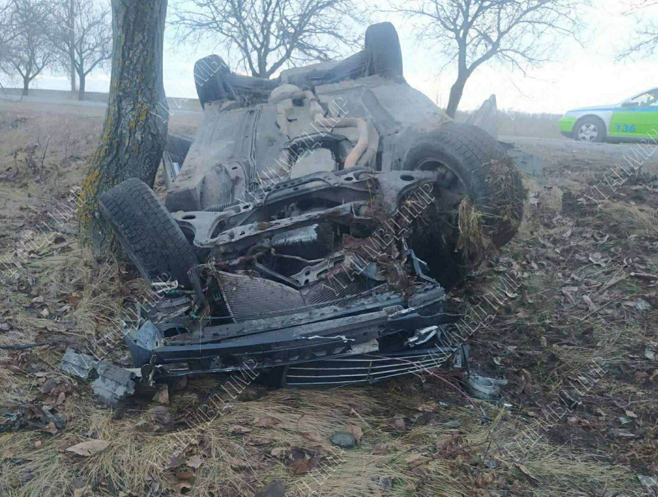 Машина врезалась в дерево и перевернулась. Пострадали водитель и пассажир