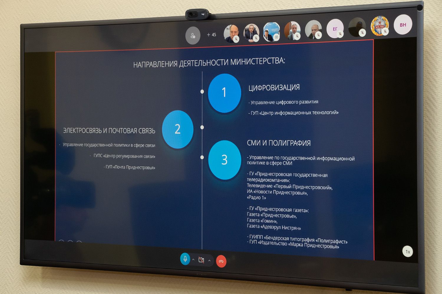 С докладом выступил министр Сергей Бабенко. Он напомнил, что основные задачи возглавляемого им ведомства связаны с формированием и реализацией государственной политики в трех сферах: информационных технологий, электросвязи, СМИ. Минцифры подведомственны два учреждения – ПГТРК и «Приднестровская газета», а также пять унитарных предприятий: центры информационных технологий и регулирования связи, почта, типография «Полиграфист», издательство «Марка Приднестровья».
