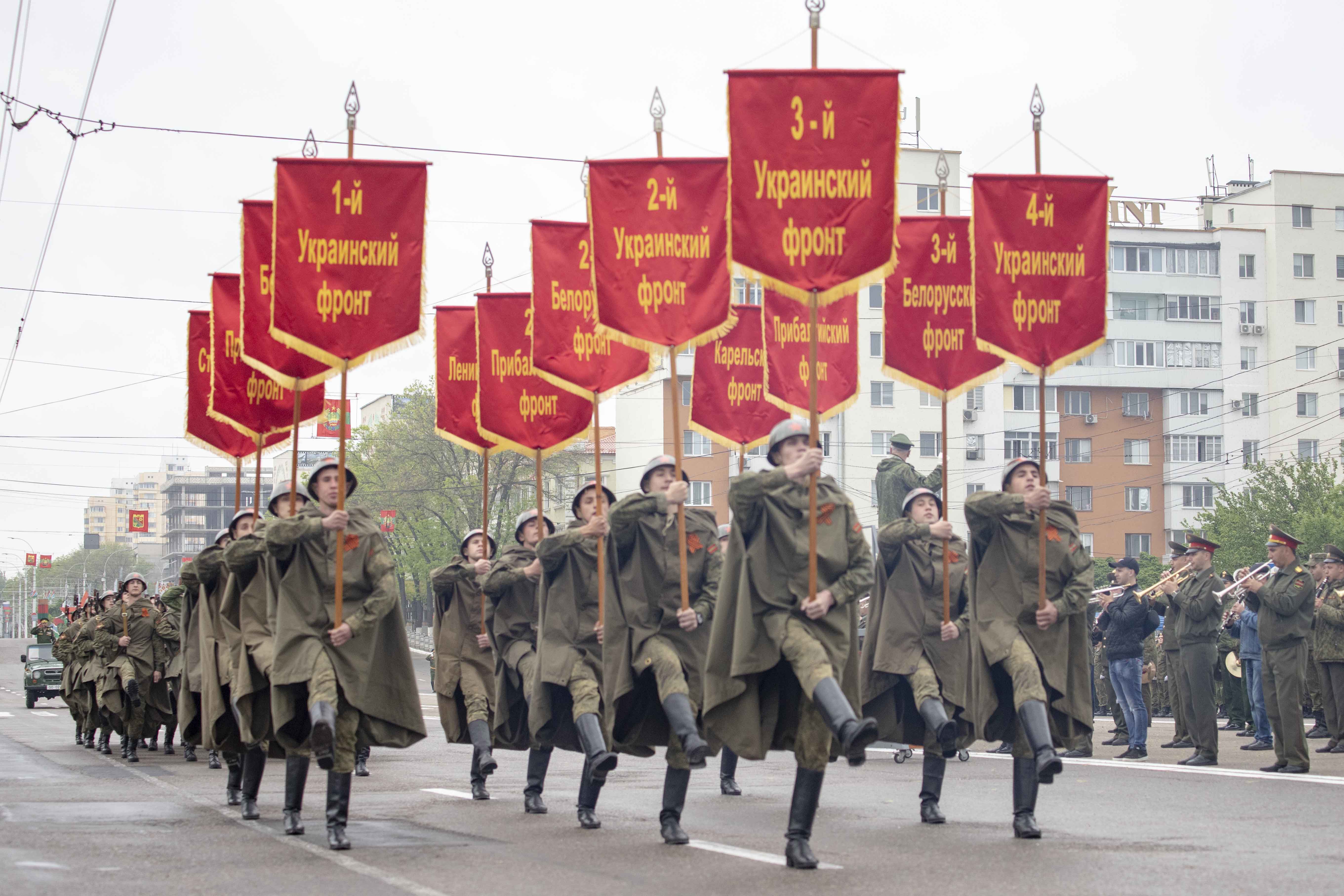 Тирасполь, 7 мая. /Новости Приднестровья/. В столице на площади Суворова прошла генеральная репетиция военного парада, посвященного 74-й годовщине Победы советского народа в Великой Отечественной войне. По традиции парадные расчеты возглавил легендарный символ Победы – танк Т-34. За ним проследовали курсанты Военного института Министерства обороны в форме времен Великой Отечественной войны с 13 штандартами победных фронтов.