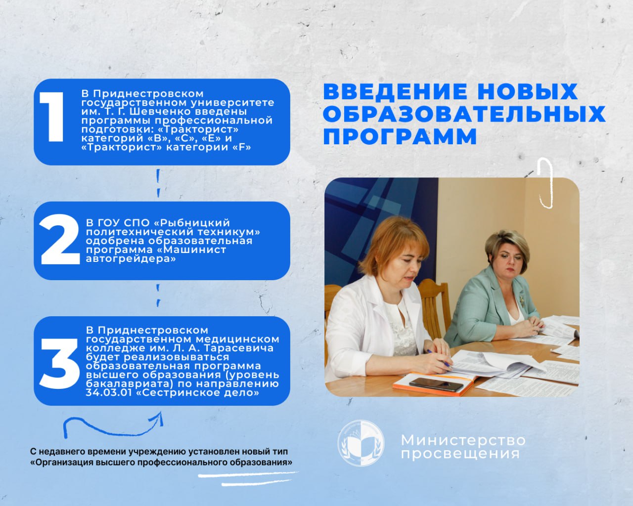 Членами коллегии одобрено введение новых образовательных программ подготовки специалистов. Так, в Приднестровском государственном университете им. Т. Г. Шевченко введены программы профессиональной подготовки «Тракторист категорий B, C, E» и «Тракторист категории F».