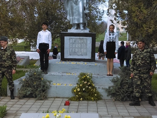 Дети читали стихи о героях Великой Отечественной войны, а школьники организовали у памятника вахту памяти. После окончания митинга прошла церемония возложения цветов.