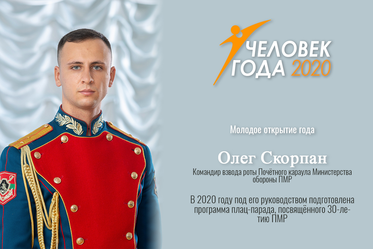 Тирасполь, 28 февраля. /Новости Приднестровья/. Молодым открытием года XXIV художественно-публицистического конкурса «Человек года – 2020» стал командир взвода роты Почётного караула Министерства обороны ПМР Олег Скорпан.