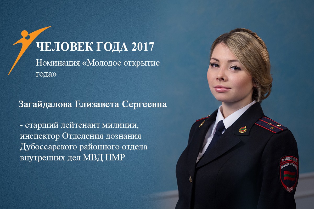 Елизавета Загадайлова пользуется заслуженным авторитетом среди коллег, оказывает практическую помощь сотрудникам различных служб Дубоссарского РОВД. За результативную работу по итогам 2017 года была занесена на Доску почета, также ей присвоена профессиональная классность «Специалист III класса».