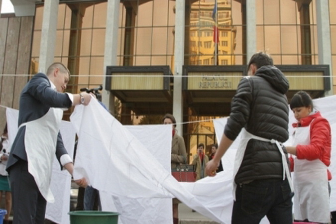 21 Мар.., 2013, 17:11Представители движения «Вместе для будущего» устроили символическую стирку перед Дворцом Республики