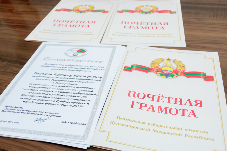 Кроме того, сегодня ряд наиболее активных членов молодежных избиркомов был удостоен ведомственных наград ЦИК и Минпроса – почетных грамот и благодарственных писем. В этот день они были вручены юношам и девушкам из Тирасполя, Бендер и близлежащих населенных пунктов. Награждения продолжатся при посещении членами ЦИК других районов республики.