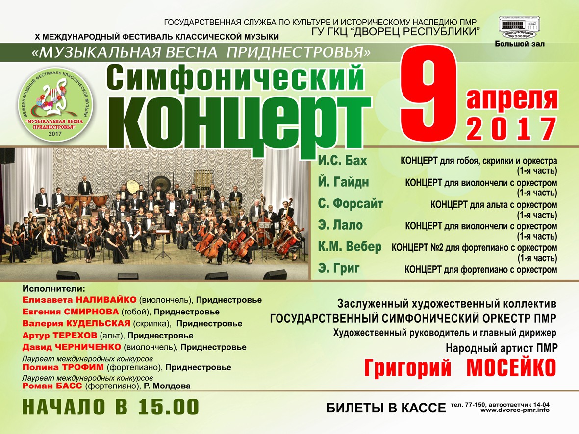 Завершится «Музыкальная весна Приднестровья» 9 апреля. В рамках большого заключительного концерта на одной сцене с Государственным симфоническим оркестром выступят студенты Приднестровского государственного института искусств, а также известный молдавский фортепианист Роман Басс. В этот вечер будут исполнены произведения Иоганна Себастьяна Баха, Йозефа Гайдна, Сесила Форсайта, Эдуара Лало, Карла Вебера и Эдварда Грига.