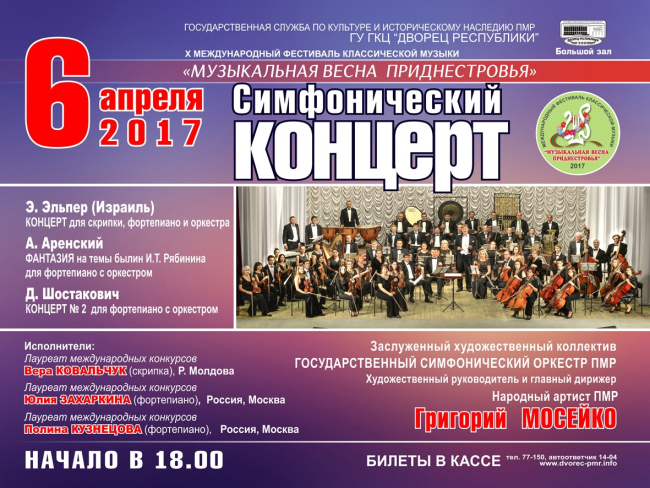Тирасполь, 5 апреля. /Новости Приднестровья/. Завтра, 6 апреля, в большом зале Дворца Республики состоится выступление Государственного симфонического оркестра ПМР в рамках Х Международного фестиваля классической музыки «Музыкальная весна Приднестровья».