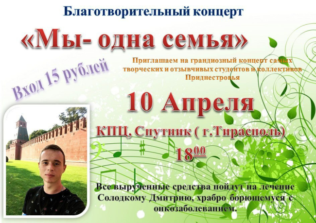 Тирасполь, 10 апреля. /Новости Приднестровья/. Сегодня в 18:00 в большом зале культурно-просветительского центра Приднестровского госуниверситета пройдет благотворительный концерт «Мы - одна семья» в поддержку студента Дмитрия Солодкого.