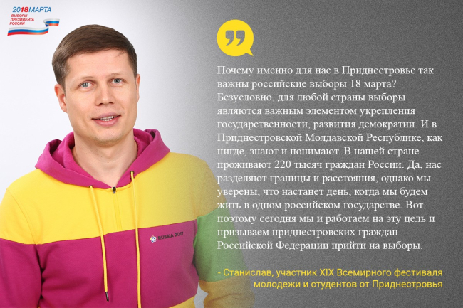 22 Фев.., 2018, 09:0918 марта 2018 г. в Российской Федерации пройдут выборы Президента. В Приднестровье будут открыты 24 избирательных участка. В республике сегодня проживают порядка 220 тысяч граждан РФ. В связи с этим участники XIX Всемирного фестиваля молодежи и студентов от Приднестровья проводят с 20 февраля по 18 марта 2018 г. Республиканскую информационную кампанию «Приднестровье голосует вместе с Россией. Россия в моем сердце!».