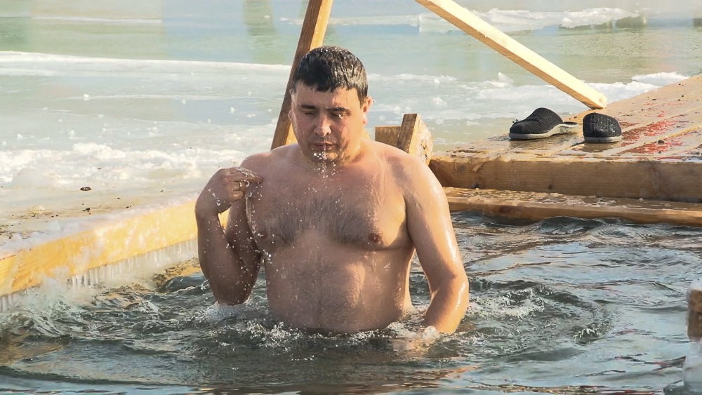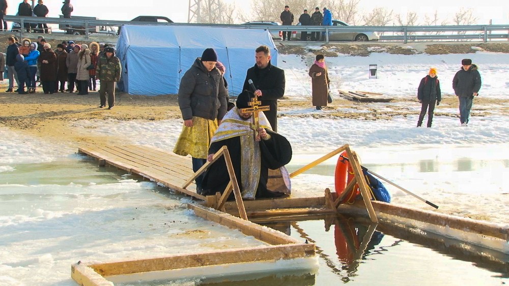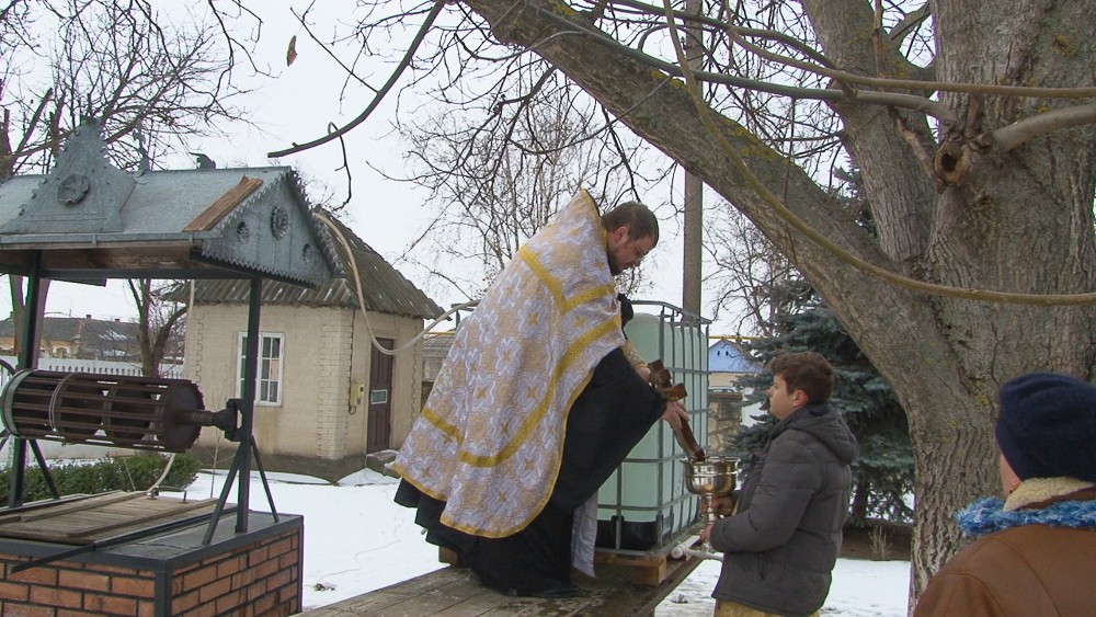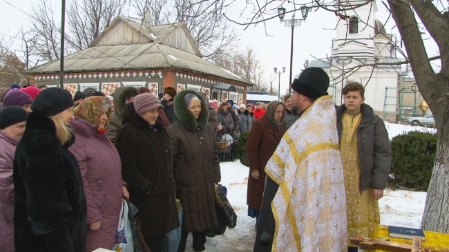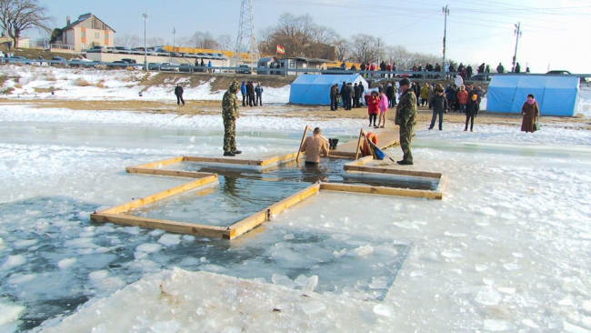Для желающих окунуться в крещенскую воду на берегу реки Днестр по традиции сделаны проруби в виде креста. Сегодня на этом месте также многолюдно. Перед началом купания купель освятил благочинный дубоссарского собора Всех Святых Протоиерей Георгий.