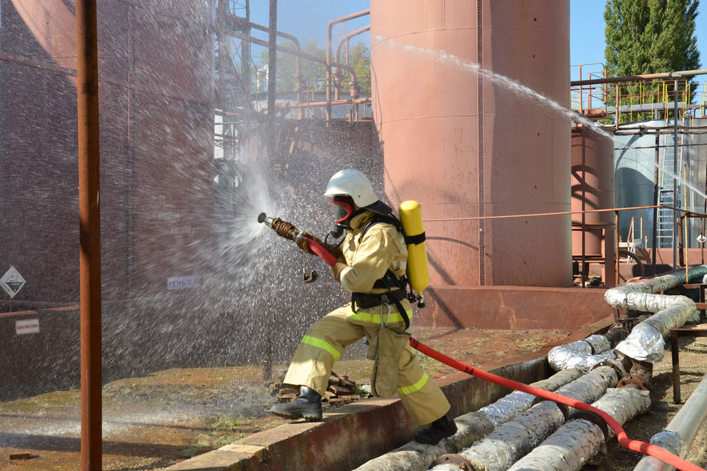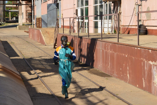 Практические занятия начались с вводной об образовании течи бака для хранения серной кислоты. Якобы из-за ремонтных работ на участке хозяйственно-пожарного водопровода на территории отсутствует водоснабжение. Прибывший к месту вызова расчёт военизированной пожарной части № 4 по охране Молдавской ГРЭС обеспечил смыв вытекшей серной кислоты в дренажный колодец и установил водяную завесу на пути распространения облака паров кислоты.