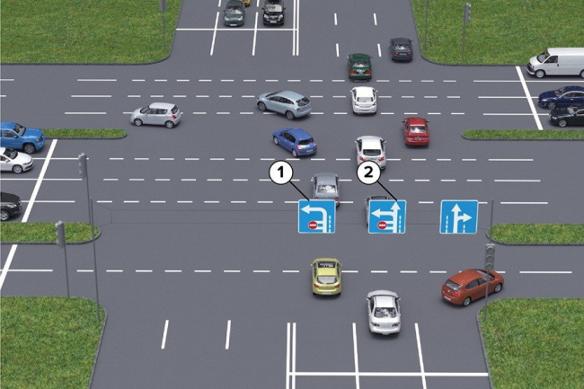 Введенные знаки направления движения на следующем перекрестке помогут водителям перестроиться заранее, а знак перестроения на параллельную проезжую часть проинформирует автомобилистов о приоритетах движения. Есть несколько вариантов обозначений направления движения по полосе с размещением на стрелах дополнительных знаков.