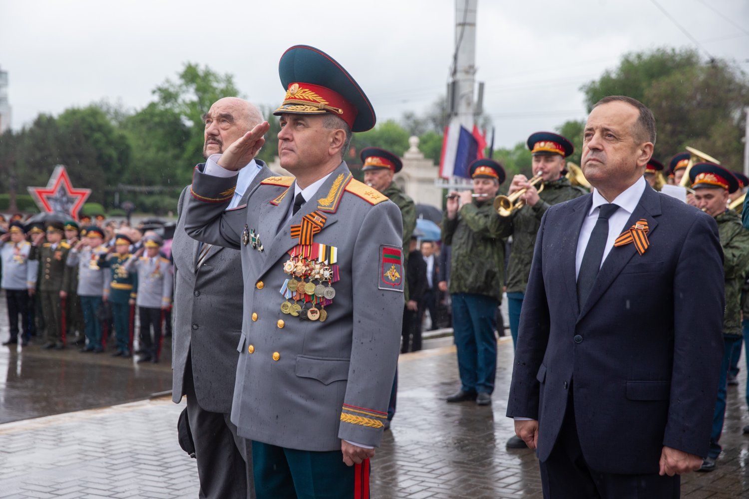 Официальная делегация во главе с Президентом ПМР Вадимом Красносельским приняла участие в торжественной церемонии поднятия Знамени Победы.