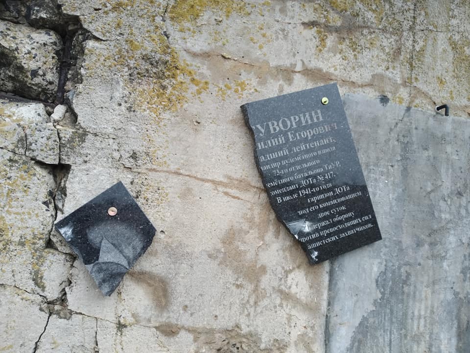 На стене ДОТа, которым командовал Суворин, в его честь установили памятную доску. На днях её разбили.