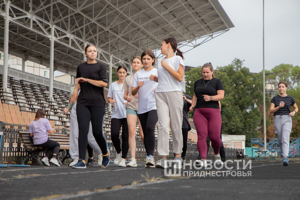Преподаватель физической культуры Александр Диденко ежедневно занимается на городском стадионе со студентами Приднестровского госуниверситета им. Т. Г. Шевченко.