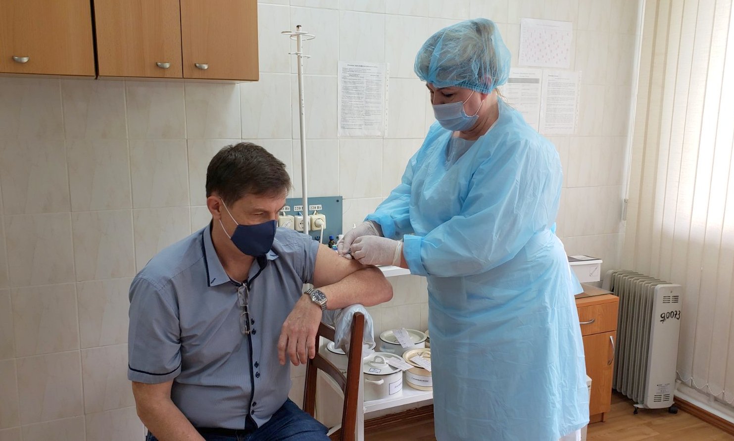 Первый этап вакцинации проводится в здравпункте предприятия. Как положено, перед прививкой проводится медосмотр, а после введения вакцины людей оставляют на некоторое время для наблюдения за реакцией организма.