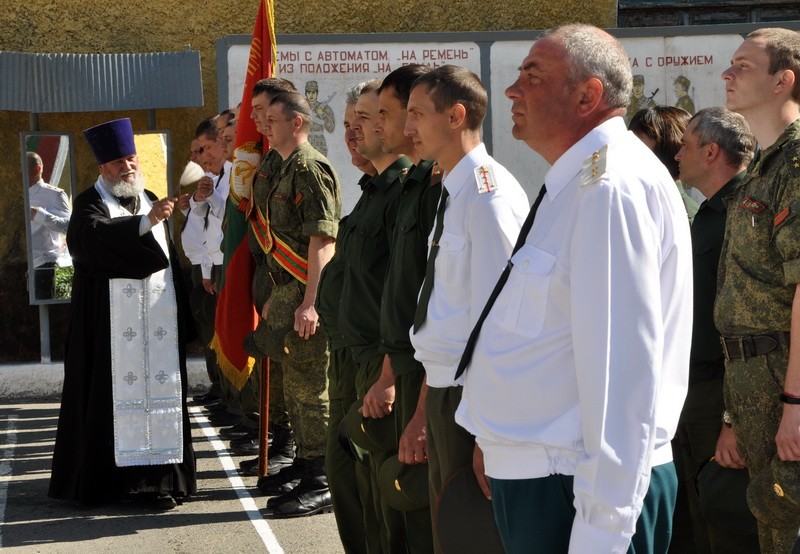 Священнослужитель войсковой части отец Михаил благословил солдат на ратную службу и окропил их освященной водой.