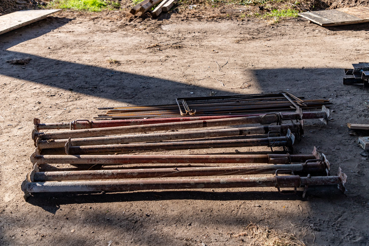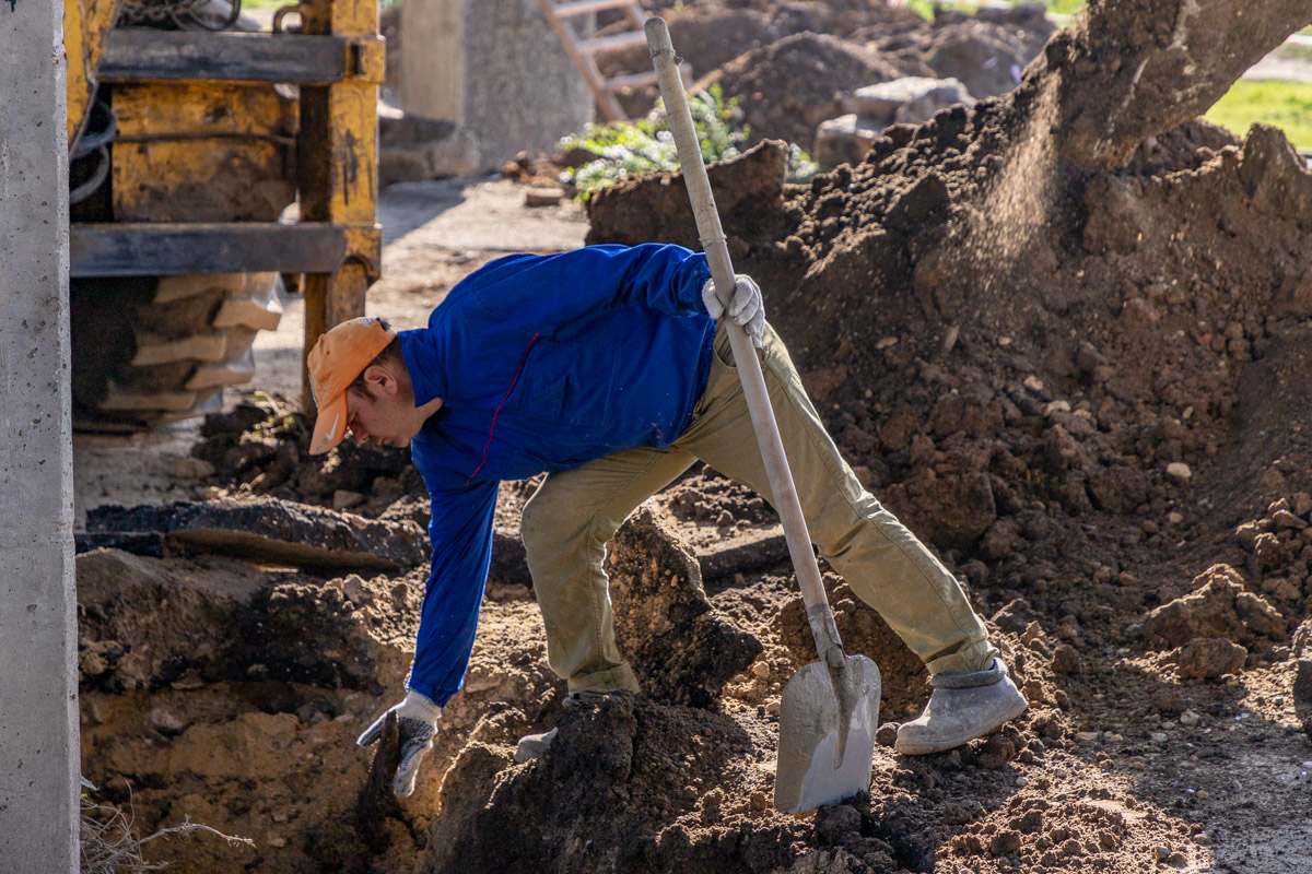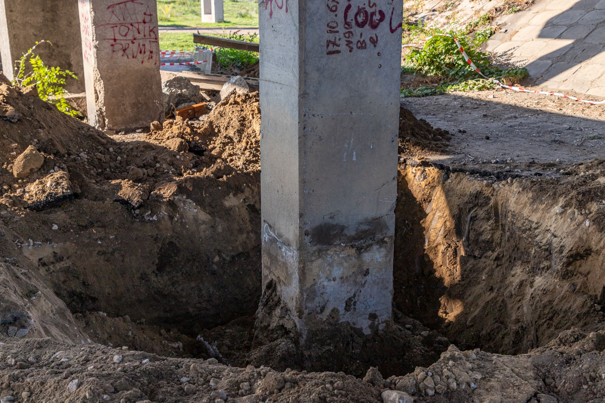 Работать будут по линиям вдоль моста – сначала сделают один ряд, потом второй и так далее. Рядов 5 по 12 колонн, всего получается 60 штук. Каждую нужно раскопать до основания фундамента этой колонны, обработать её, подвязывать арматурой, сделать опалубку и залить бетоном.