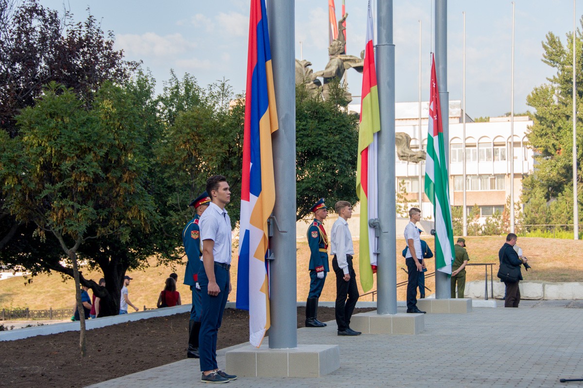 Напротив государственных флагов Абхазии, Южной Осетии и Арцаха развеваются флаги Приднестровья и России. 2 сентября – в день 28-й годовщины образования ПМР – рядом с ними будут подняты флаги всех городов и районов нашей республики.