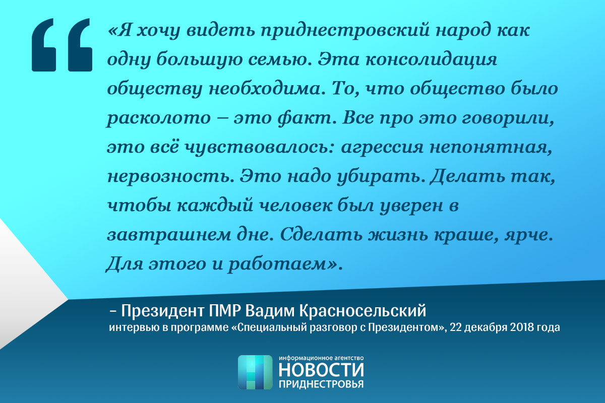 Цитаты Надо работать так, чтобы каждый приднестровец был уверен в завтрашнем дне 26 Дек.., 2018, 10:42 Президент