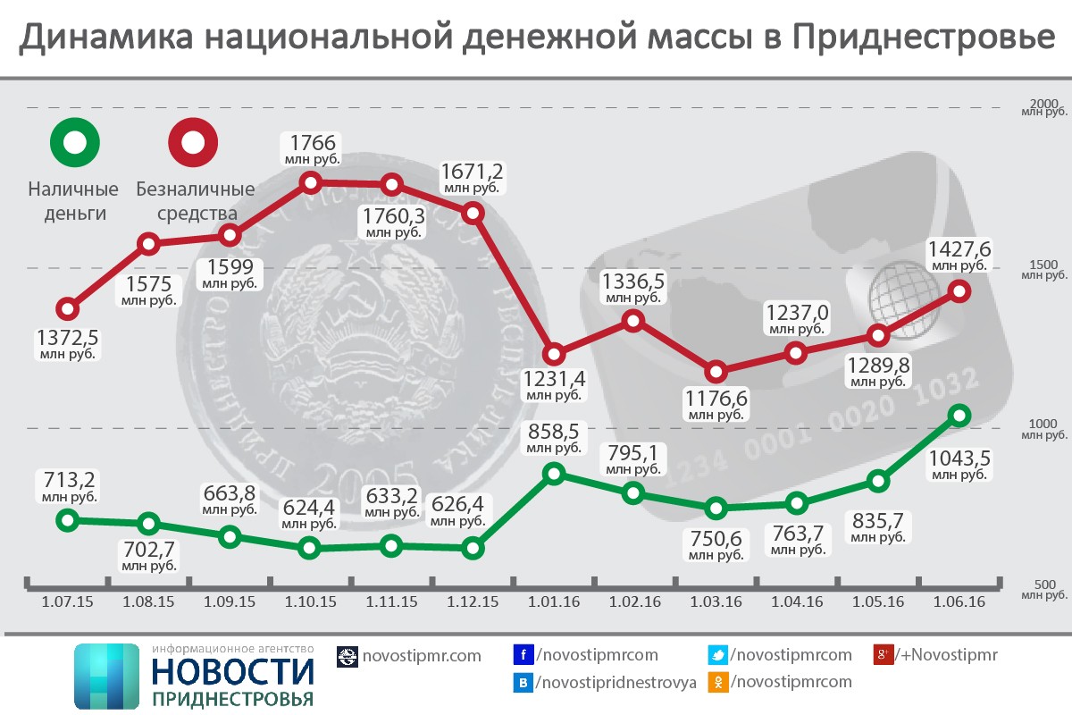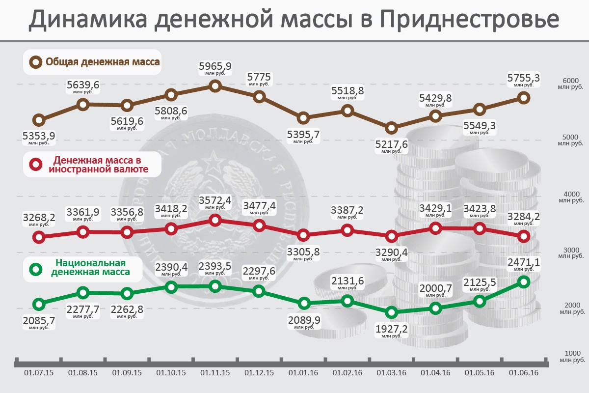 Отметим, что национальная денежная масса (то есть средства в рублях ПМР) за май существенно возросла — более чем на 16%, в то время как денежная масса в иностранной валюте сократилась на 4,1%.