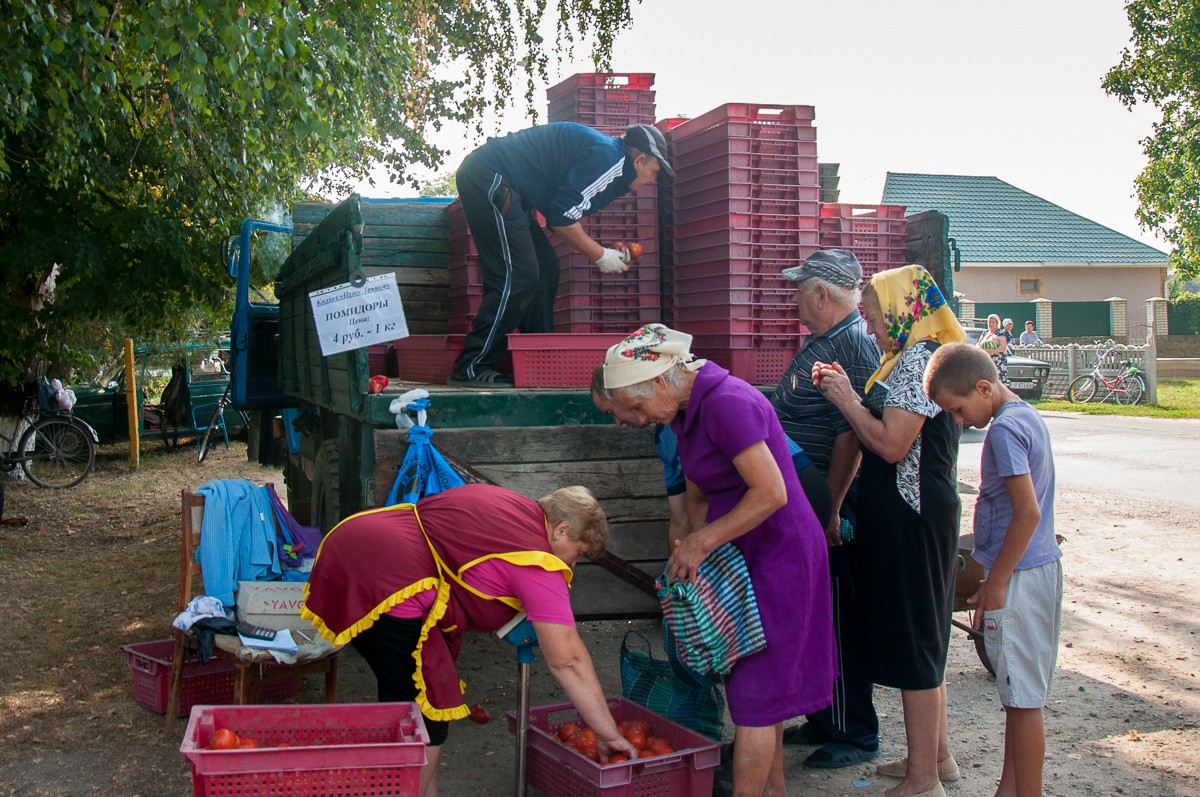 В центре села продают помидоры, люди массово стекаются к машинам со спелыми томатами.