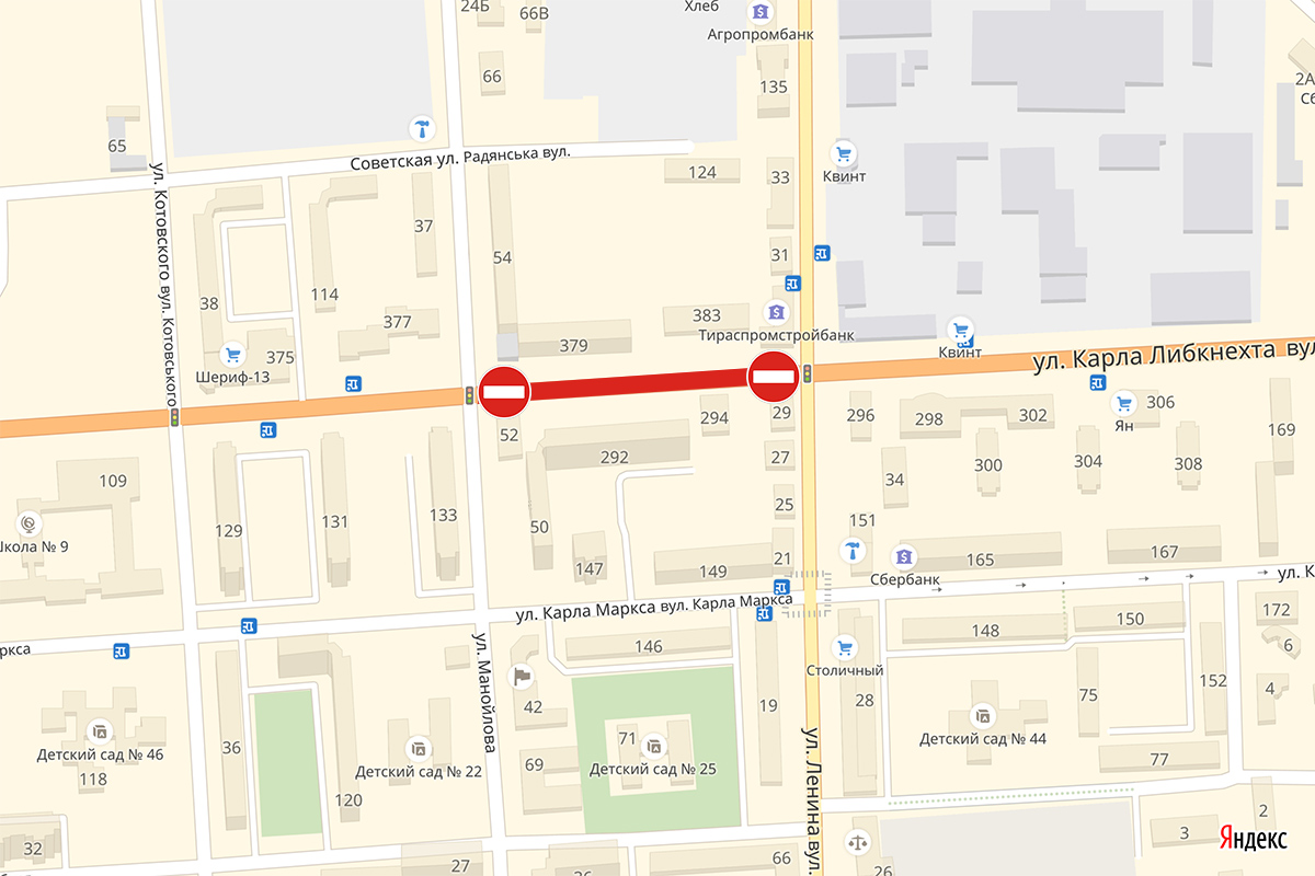 Тирасполь, 19 сентября. /Новости Приднестровья/. С 22 сентября с 21:30 в Тирасполе будет перекрыто движение транспорта по ул. Карла Либкнехта – на участке от ул. Ленина до ул. Манойлова. Здесь будут производиться работы по прокладке кабельной линии. Движение планируют восстановить в 05:00 23 сентября.