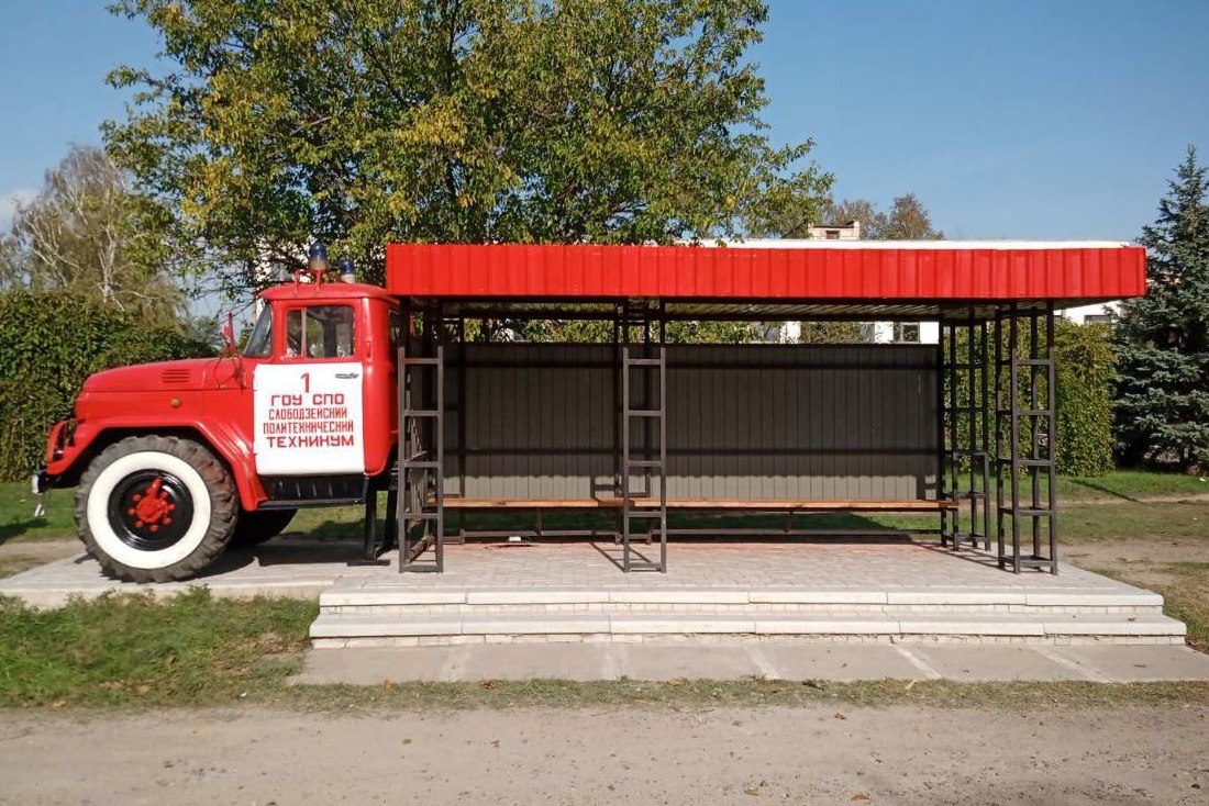 Управление пожарной охраны выделило кабину от списанного ЗИЛ-131. Сотрудники политеха её отреставрировали, перекрасили остановку и установили обновлённую кабину.